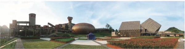 三线工业遗产的记忆符号是指在工业遗产中表现出的引起人们回忆的符号形式,以及符号内在蕴含的工业文化和工业历史等。提炼文化记忆要素内容、探寻三线工业遗产文化记忆的符号表达机制,是构建三线工业文化记忆空间的重要依托。根源于文化记忆的符号性,三线工业遗产承载着三线建设的生活记忆,从文化记忆要素的组成关系中,以文化记忆符号群共同建构一种文化空间。通过凝练文化标志符号、设计赋能使得文化记忆要素内容与工业符号相互转变,形成强烈的文化感知,更好地营造三线工业遗产文化属地认同感。如“六枝记忆”三线建设产业园依托洗煤厂旧厂房,打造一个集建筑、展陈和艺术“三位一体”的综合文化空间(图2),包括源于“洗煤”工艺的接待中心(图3a),体现安全帽元素的金色大厅(图3b)和反映煤矿工具“风镐”的大型公共艺术装置(图3c)等;随处可见的三线建设元素构建了六枝的三线文化记忆空间。
